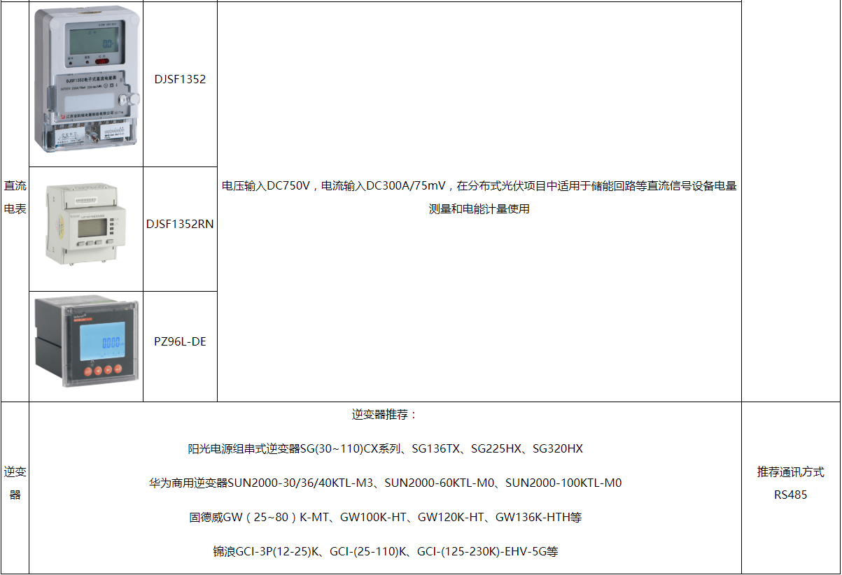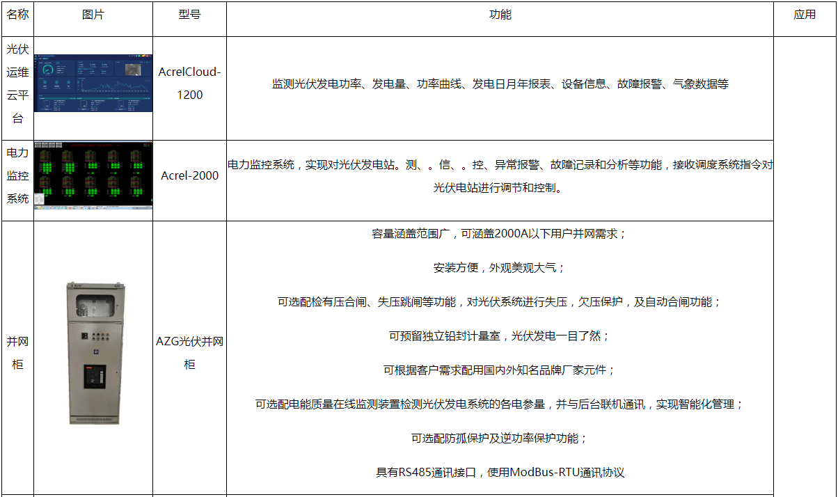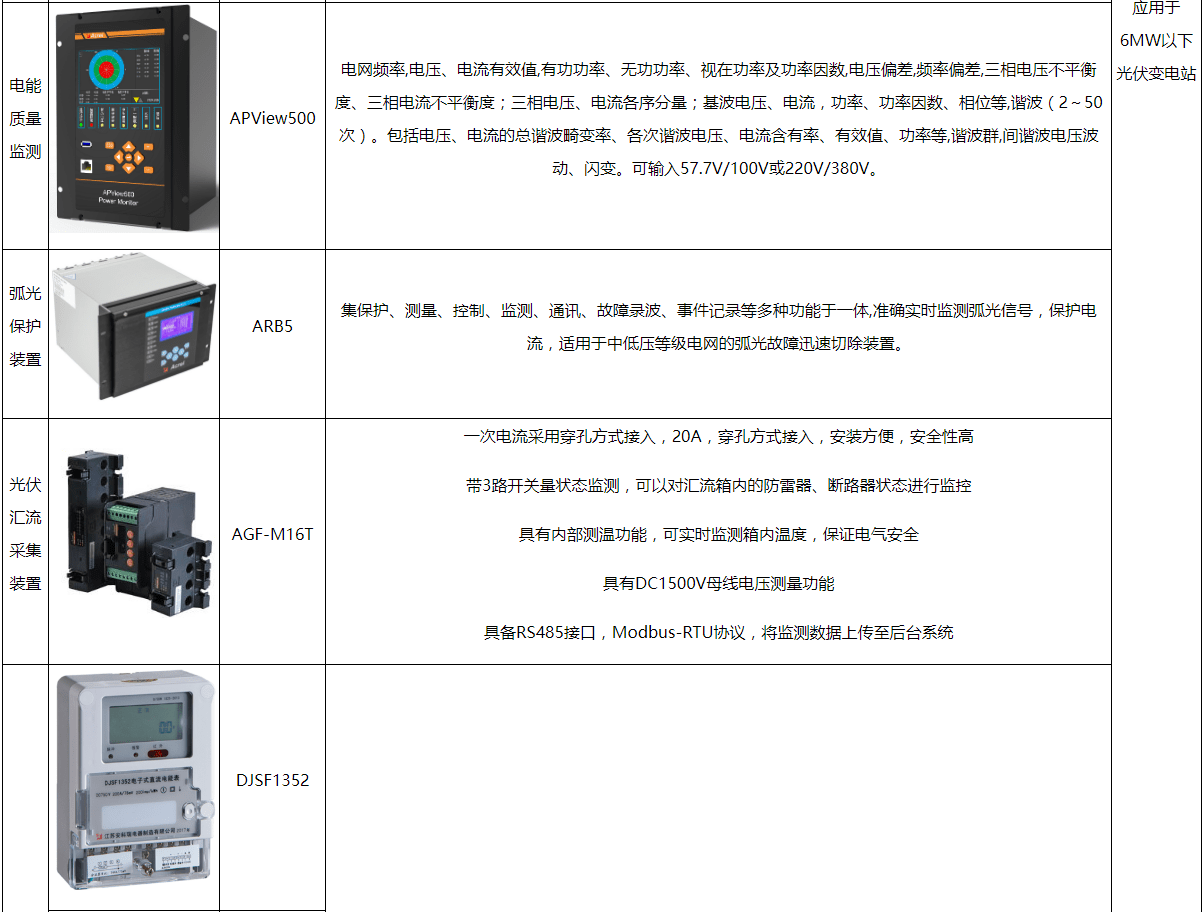 上图为一个1MW分布式光伏电站的示意图,光伏阵列接入光伏汇流箱,经过直流柜汇流后接入集中式逆变器(直流柜根据情况可不设置),最后经过升压变压器升压至10kV或35kV后并入中压电网。由于光伏电站装机容量比较大,涉及到的保护和测控设备比较多,主要如下表: