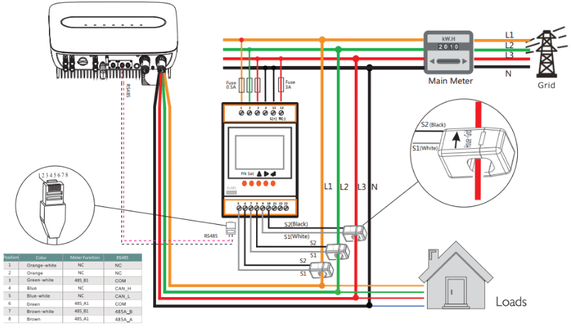 部分光伏电站并网点需要监测并网点电能质量,包括电源频率、电源电压的大小、电压不平衡、电压骤升/骤降/中断、快速电压变化、谐波/间谐波THD、闪变等,需要安装单独的电能质量监测装置。部分光伏电站为自发自用,余电不上网模式,这种类型的光伏电站需要安装防逆流保护装置,避免往电网输送电能,系统图如下。