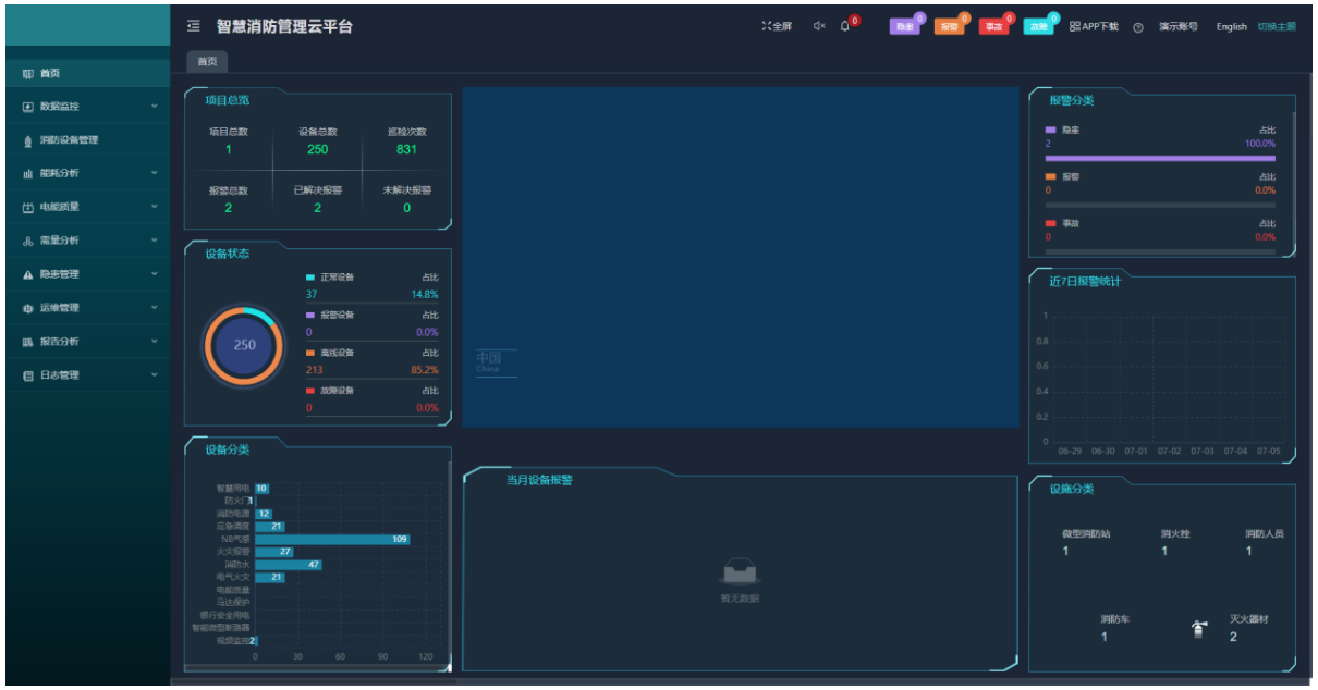 智慧消防云平台基于物联网、大数据、云计算等现代信息技术,将分散的火灾自动报警设备、电气火灾监控设备、智慧烟感探测器、智慧消防用水等设备连接形成网络,并对这些设备的状态进行智能化感知、识别、定位,实时动态采集消防信息,通过云平台进行数据分析、挖掘和趋势分析,帮助实现科学预警火灾、网格化管理、落实多元责任监管等目标。实现了无人化值守智慧消防,实现智慧消防“自动化"、“智能化"、“系统化"需求。从火灾预防,到火情报警,再到控制联动,在统一的系统大平台内运行,用户、安保人员、监管单位都能够通过平台直观地看到每一栋建筑物中各类消防设备和传感器的运行状况,并能够在出现细节隐患、发生火情等紧急和非紧急情况下,在几秒时间内,相关报警和事件信息通过手机短信、语音电话、邮件提醒和APP推送等手段,就迅速能够迅速通知到达相关人员。