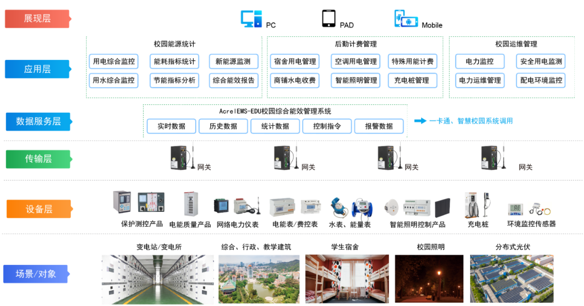 AcrelEMS-EDU校园综合能效管理解决方案针对校园能源统计、后勤计费管理、校园运维管理等提供高校的信息化管理平台。从“源、网、荷、储、充"多个角度解析高校当下及未来的用能问题及用能需求,在统一的需求下“实现能源互补、信息互通"等管理模式。助力学校管理智能化、数字化、综合化,实现节能校园、绿色校园、低碳校园。