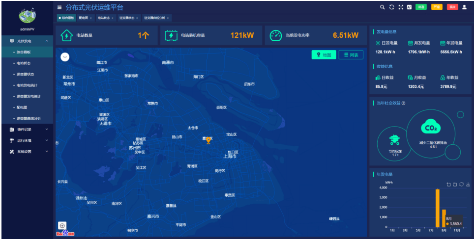 ●显示所有光伏电站的数量,装机容量,实时发电功率。