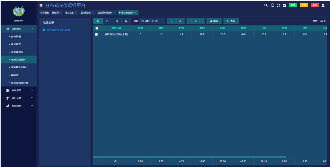 ●展示所选电站的时、日、月、年发电量统计报表。
