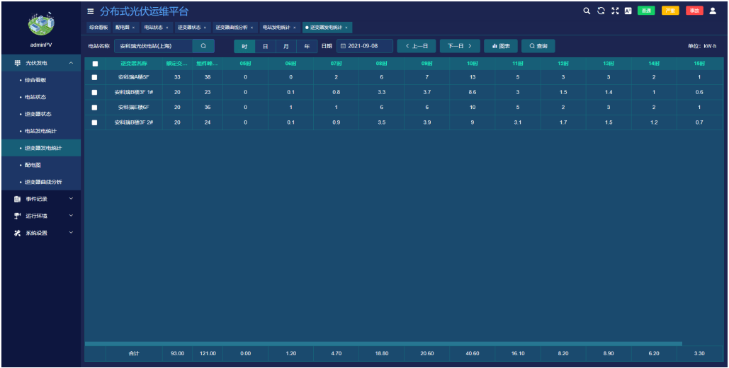 ●展示所选逆变器的时、日、月、年发电量统计报表