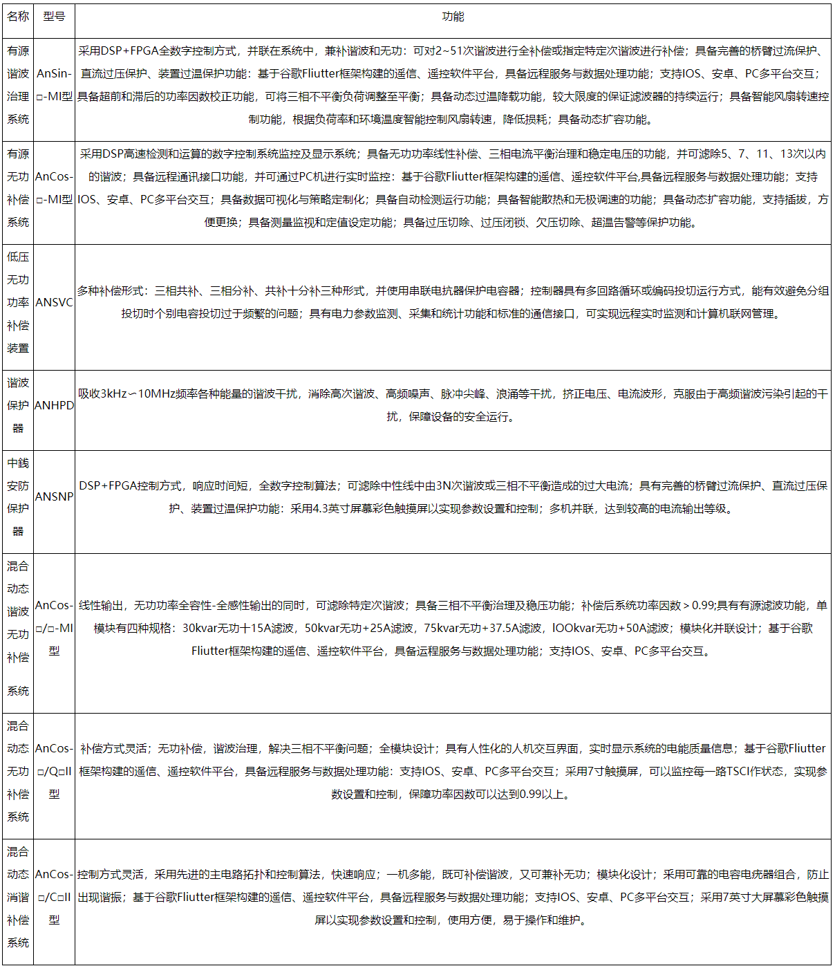 AnSinI系列有源电力滤波装置,以并联方式接入电网,通过实时检测负载的谐波和无功分量,采用PWM变流技术,从变流器中产生一个和当前谐波分量和无功分量对应的反向分量并实时注入电力系统,从而实现谐波治理和无功补偿。