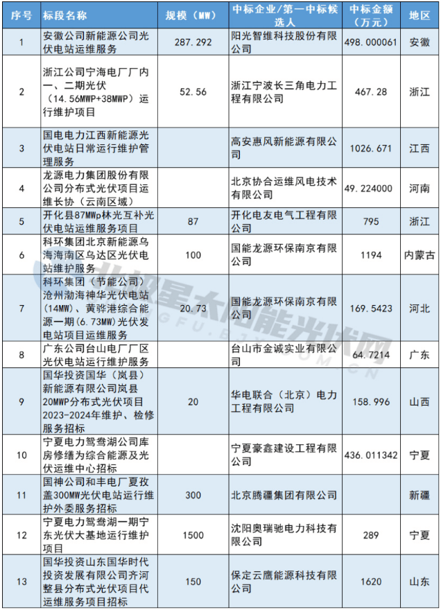 在光伏、储能行业飞速发展的同时,已建的光伏、风力发电站和储能系统的监控、运维管理项目的招标也非常多,2023年上半年,光伏电站开发企业运维招标规模28.6GW,同比增长204.3%,上述28.6GW招标项目中,目前公布中标结果的共计14.9GW,中标情况见表1。光伏代运维价格因光伏电站的地理分布、容量、环境以及考核条件的不同,价格也会有较大的差异,从表1可以看出运维价格*低至1.93元/年*kW。
