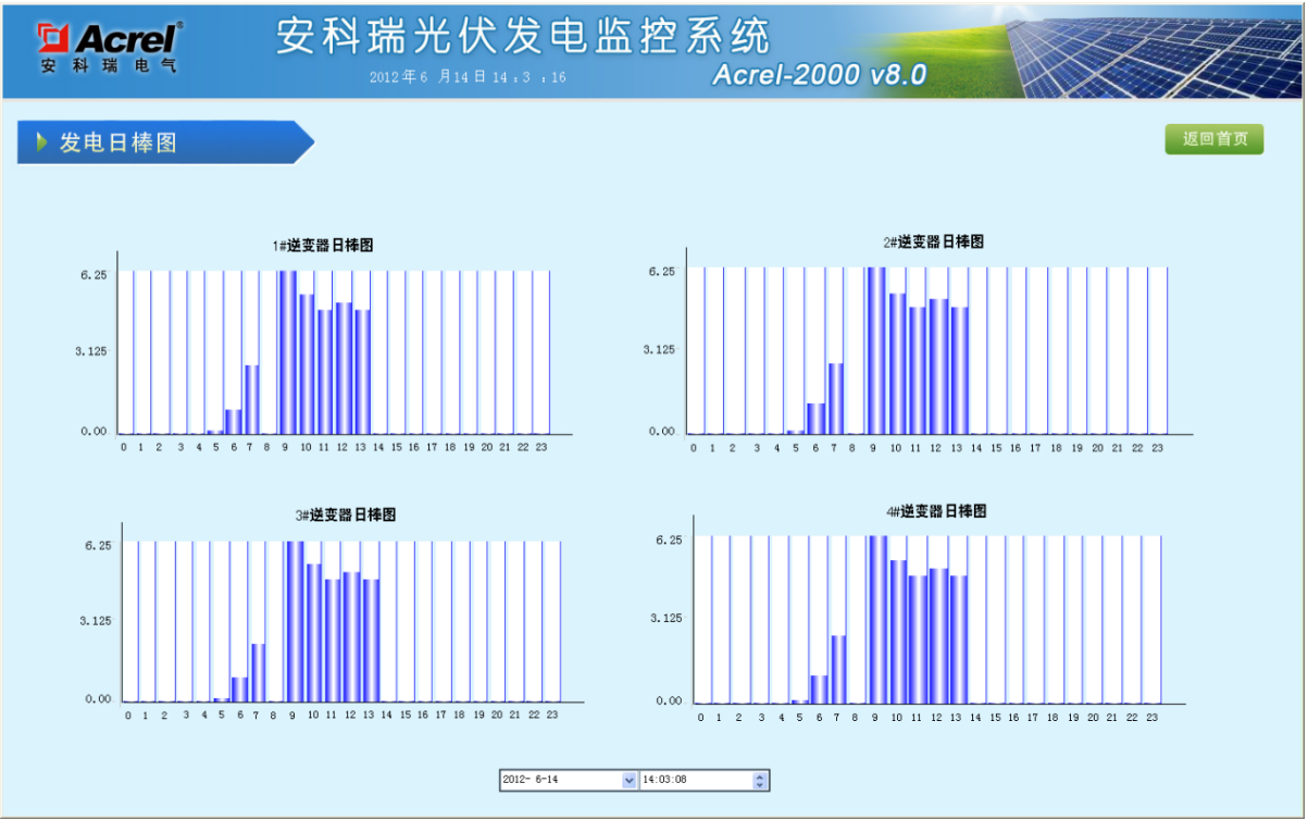 能够根据微逆变反应的数据显示各组太阳能电池板的工作状态(是否正常发电),根据组串式逆变器显示各光伏组串输出功率,分别计量两种两种逆变方式的发电量日发电量、日发电量曲线、月发电量柱状图、年发电量柱状图等,并对这两种方式发电量进行对比。