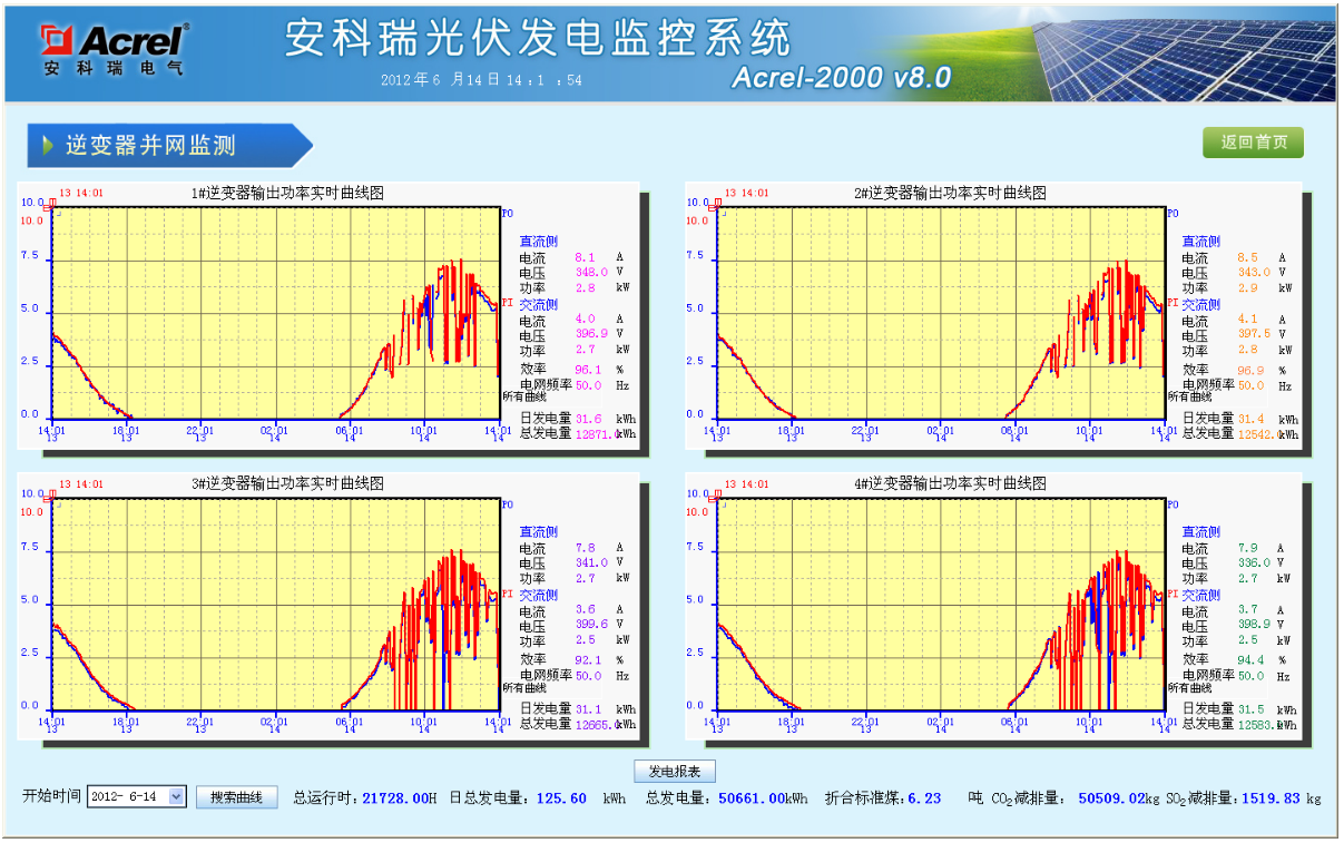 监控系统可绘制显示逆变器电压—时间曲线、功率—时间曲线等,直流侧输入电流实时曲线、交流侧逆变输出电流曲线,并采集与显示各逆变器日发电量等电参量;