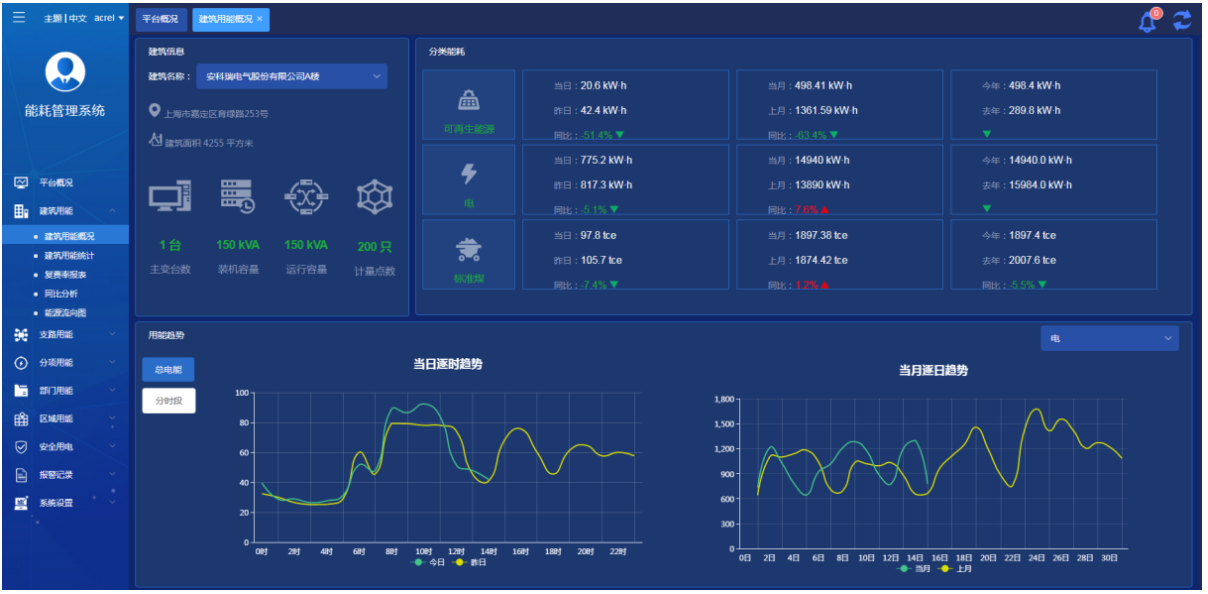对建筑、部门、区域、支路、分类分项等用能进行对比,支持当日逐时趋势、当月逐日趋势曲线、分时段能耗统计对比、总能耗同环比对比。