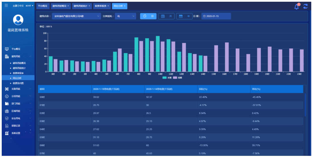对建筑、分项、区域、支路等用能按日、月、年以图形和报表结合的方式进行用能数据同比分析。