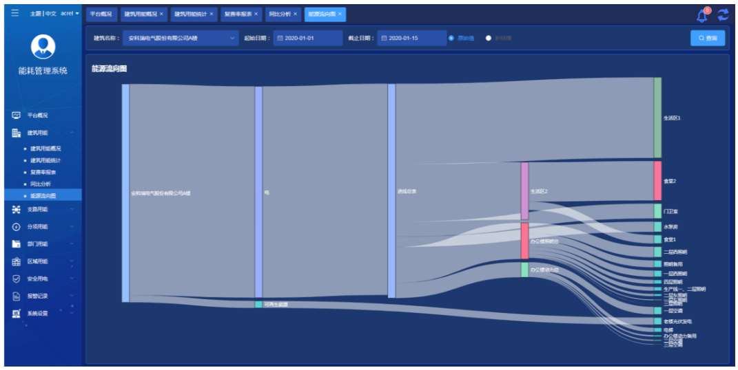 能源流向图展示单栋建筑时段内各类能源从源头到末端的的能源流向,支持按原始值和折标值查看。