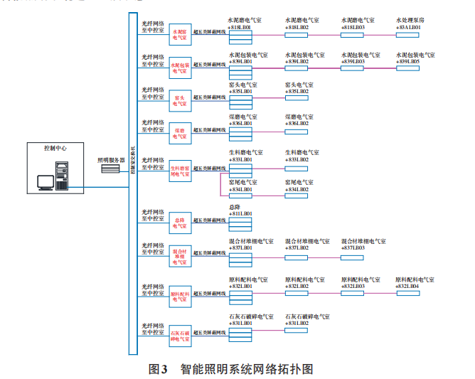 各电气室的网络机柜通过光纤通讯汇总至中控室的网关,将信号送至智能照明服务器以及照明系统监控主机,由监控主机对全厂的照明灯具进行管理和控制。本项目的智能照明控制系统网络拓扑如图3所示。