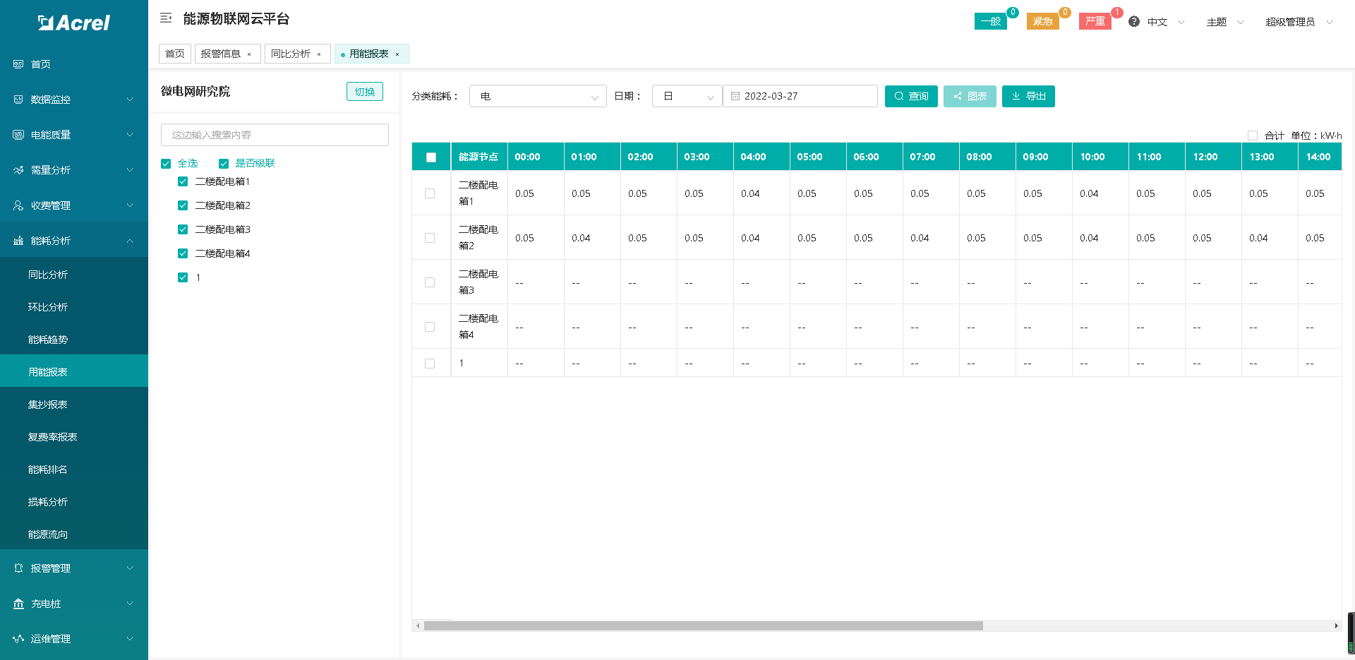 6)报表中心:提供售电、售水财务报表、用能报表、报警报表等查询,本系统所有的报表及记录查询,都支持excel格式导出。