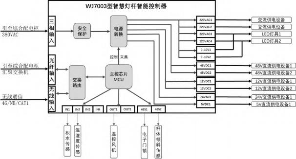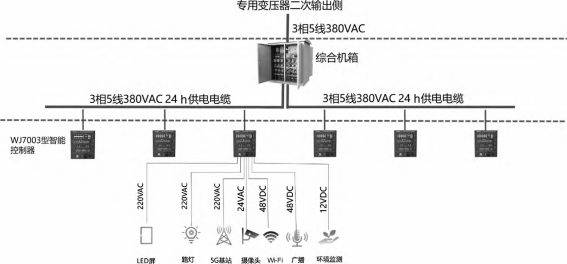供电系统整体架构如图1所示,分为变压器至综合机箱、综合机箱至灯杆、灯杆至设备三层供电结构。从变压器二次输出侧引入一路380VAC供电电缆至综合机箱,综合机箱根据需要的供电回路方向和数量,分别引出380VAC24h供电缆至每个内安装的智慧灯杆智能控制器,智能控制器输出220VAC、24VAC、48VDC、12VDC、5VDC不同电压等级回路供给杆体上挂载各类设备。