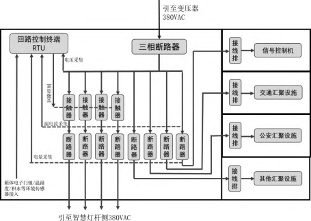 综合机箱内部供电设计如图2所示,综合机箱采用5仓体设计,分为综合配电仓、信号机控制仓、交通汇聚设施仓、公安汇聚设施仓、其他汇聚设施仓;变压器二次侧引入380VAC至综合机箱内综合配电仓体的三相断路器总闸,由三相断路器总闸分别引至交流接触器和断路器,交流接触器用以控制回路供电通断,断路器用以控制回路过载保护及手动通断,断路器一部分回路通过电缆引至每根智慧灯杆给杆体挂载设备供电,另一部分引至其他汇聚仓体给仓体内汇聚设备供电。