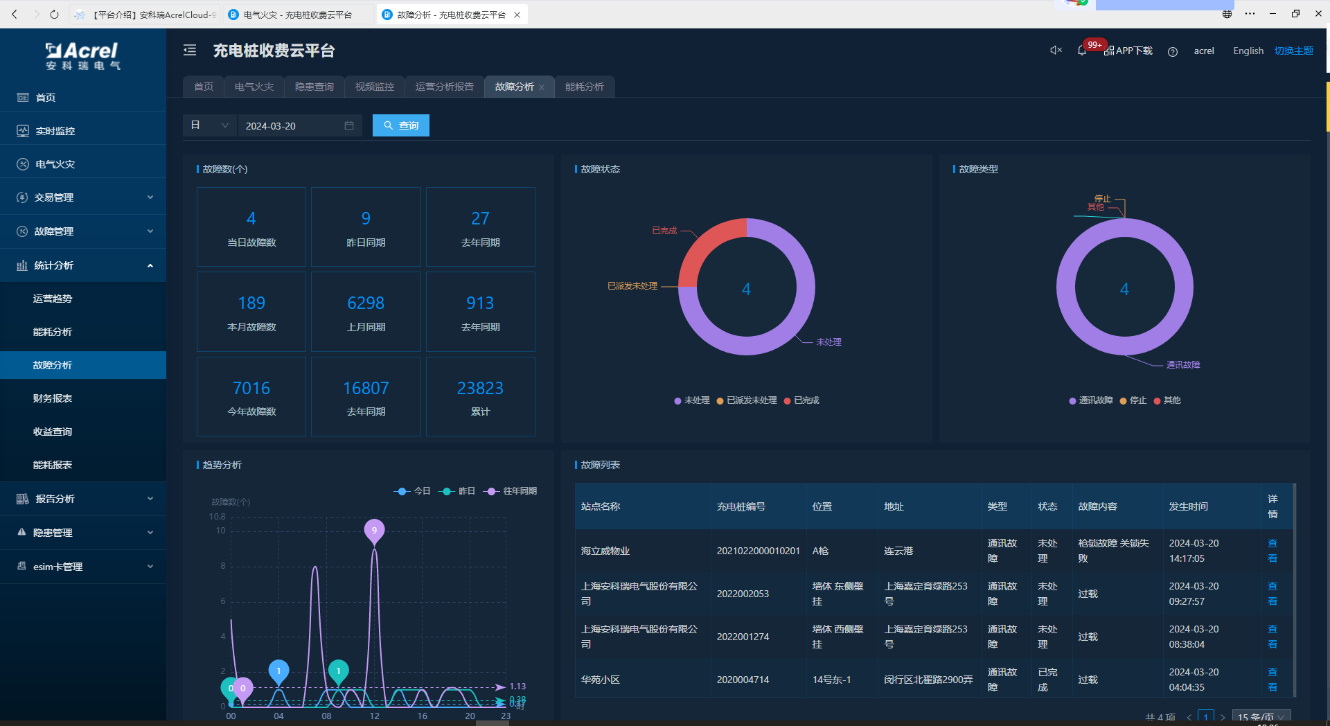 在故障分析中,可查看相关时间内的故障数、故障状态、故障类型、趋势分析以及故障列表。如图所示: