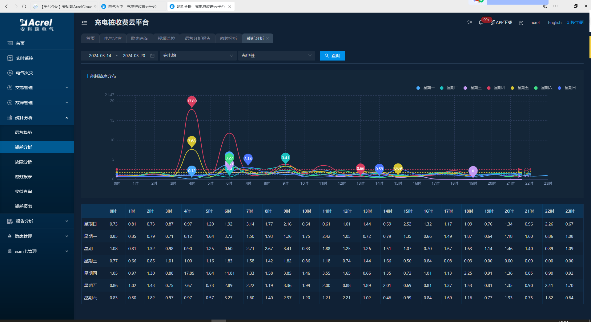在能耗分析中,可查看Z定时段关联站点和关联桩的能耗信息并显示对应的能耗趋势图。如图所示:
