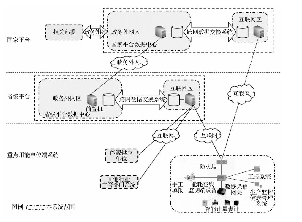能耗在线监测系统以准确、有效的计量器具为基础,结合计算机和网络通信技术,实时监测用能单位的能源运行数据,形成各个行业的能源运行图,把握*点行业、*点企业及关键工序的能耗,实现“物联网"技术在能源计量工作中的实际应用任务。*点用能单位监测系统主要由*点用能单位接入端系统、省级平台系统和系统等3部分组成。*点用能单位监测系统的基础数据主要来自企业采集的能耗数据,上传至省级平台,通过省级平台上传至平台,能耗在线监测系统整体架构模式如图1所示。