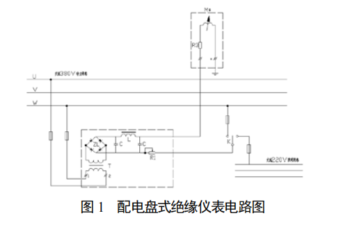 配电盘式绝缘仪表电路图见图1。当船舶电力系统为理想绝缘状态时,电网与船体之间无漏电,仪表指针停在∞标记处。当发生任意一相接地时,便有电流通过测量电路,电流由整流电源正极到仪表指针正端并通过兆欧表的接地端和电网的接地点构成闭合回路。开关K用于380V和220V网络测量转换。配电板式绝缘仪表可指示电网的绝缘电阻数值,可通过附加声光报警器增强报警的效果。