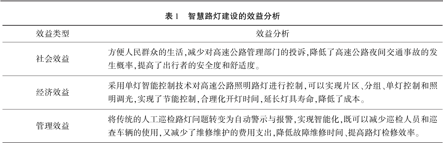 智慧路灯是分布在高速公路广泛、均匀的物联网,可成为智慧高速公路建设的切入点和智能终端,在社会、经济等方面具有较明显的效益(表1)。