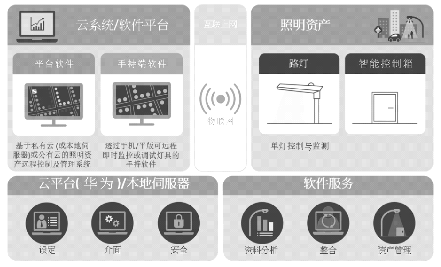 系统整合了专业高效的LED智能照明灯具、窄带物联网数据通讯、简单实用的华为云平台以及集成的服务,系统总体方案如图1所示。