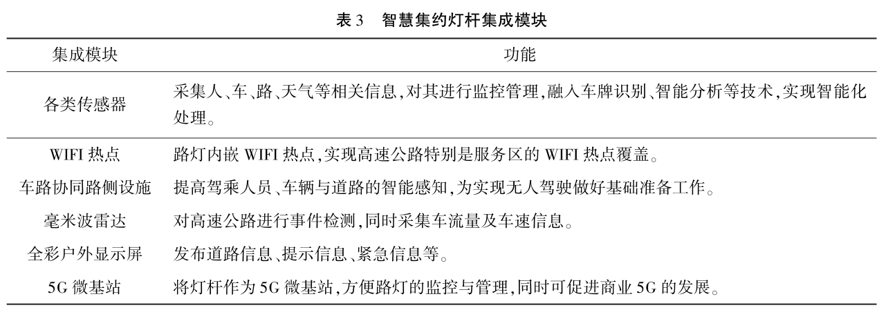 (2)利用路灯物联网承载其他上层应用。针对不同的路段情况,分析各类传感器、WIFI热点、车路协同路侧基础设施、毫米波雷达、全彩户外显示屏等信息化设备的需求,以合理设置智慧集约灯杆。同时,智慧集约灯杆也可作为5G微基站的天然搭配。这样既可提高灯杆的智慧化,又可避免设备基础等土建工程的重复建设,节约空间和建设成本。智慧集约灯杆可集成的设备见表3。
