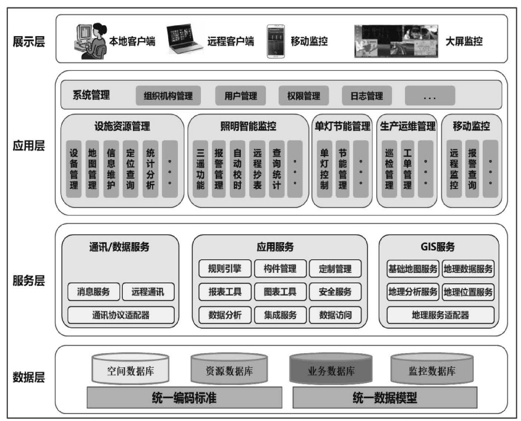(2)应用层:提供照明控制的应用功能,如设施资源管理、照明智能监控、单灯控制及节能管理、生产运维管理和移动监控等。