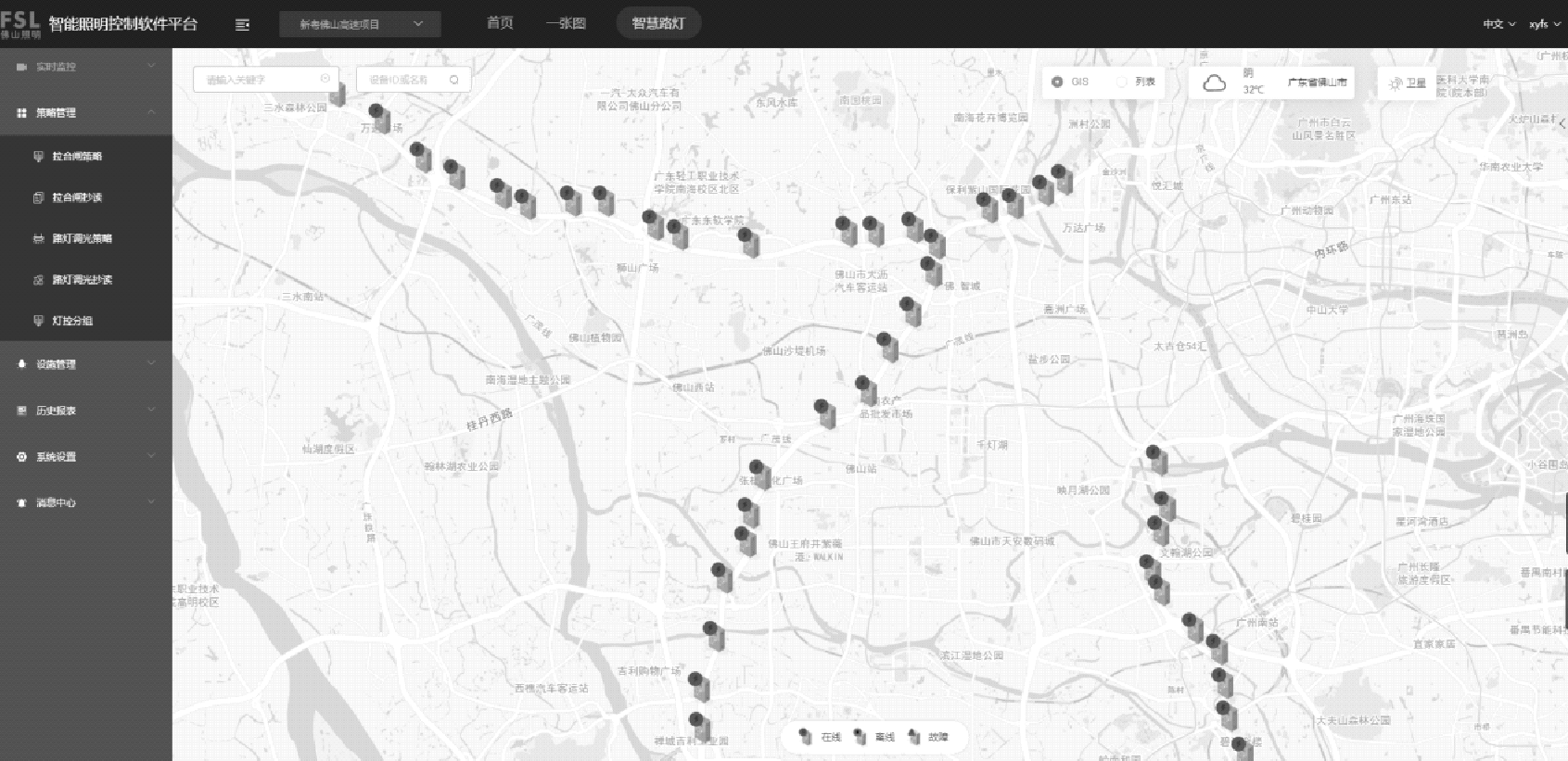 智慧照明系统自2021年1月陆续投入以来,基于单灯控制的智慧照明系统得到了佛山市照明工程路段管养单位和出行者的好评,具有故障率低、故障识别、维修速度快、调光和控制功能实用性强、维护成本低等特点。但也存在一些不足之处,如建设期未考虑与路段上的车辆检测器、气象检测器、闭路电视监视系统和可变信息标志等其他现有设备进行联动;未考虑利用灯杆集成其他信息化设备以减少对土地的占用,节约空间和后期建设成本;也没有考虑使用区别于传统照明工程的低空照明,以提高行车的诱导性,降低维护费用。