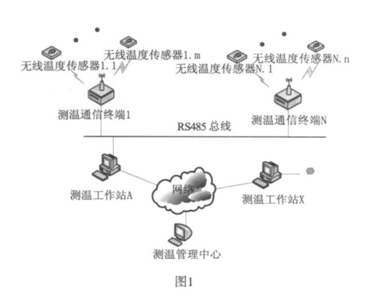 无线温度传感器。在每一个需要监测温度的节点 上安装一个无线温度传感器,该传感器每隔设定时间自动 测量所在位置的温度,并将测得的温度数据发送给测温通 信终端。