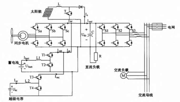 文章所阐述的分布式新能源发电系统主要指的是交直流母线混合型分布式发电系统。此发电系统主要利用新能源太阳能与风能进行发电。通常情况下,太阳能与风能发电的跟*状态都处于**功率点,但是由于这两种新能源发电模式非常容易受到天气等各种因素的影响与干扰,*终造成系统输出功率状态不能时刻保持稳定状态。因此,为了充分确保此系统可以在孤岛条件下长时间处于稳定运行状态,文章通过分析将超*电容与蓄电池作为系统储能装置,通过二者剩余容量以及自身特点等各种实际运行情况,制定出不同的控制策略,从而达到对系统能量进行有*管理的目的[1]。