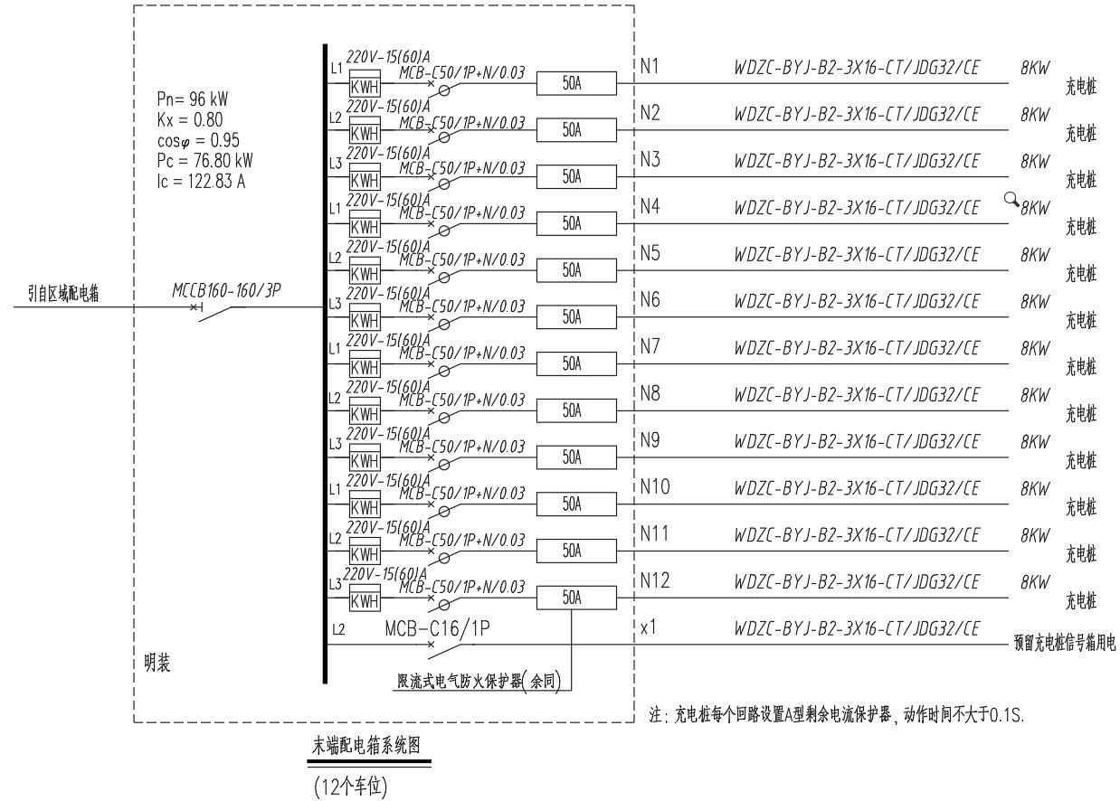 末端配电箱由区域配电箱放射式供电,本区域配电箱接于同一相的充电桩数量为1 2/3 =4 个,故 Kx 取 0 .8 ,Kt取1 .0 ,则系统图如下图 2 :