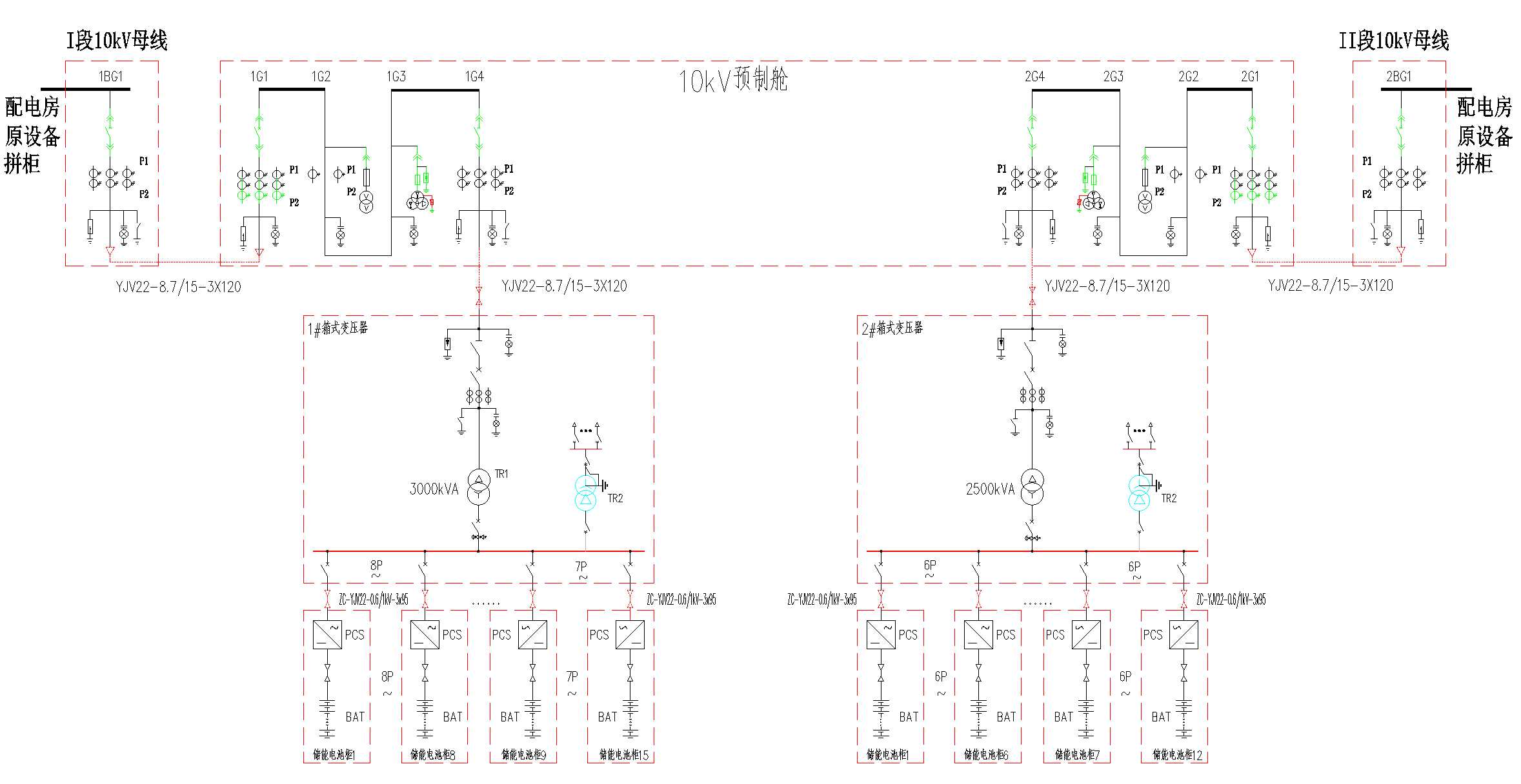 储能单元由储能一体柜、变压器、汇流站组成。本项目配置储能容量为186kW/372kWh的磷酸铁锂储能一体柜27台,3000kVA变压器1台,2500kVA变压器1台,并建设一座10kV开关舱。本次15套186kW/372kWh(即2790kW/5580kWh)的磷酸铁锂储能一体柜接入1台3000kVA升压变,12套186kW/372kWh(即2232kW/4464kWh)的磷酸铁锂储能一体柜接入1台2500kVA升压变,将直流电逆变为690V交流电,升压变高压侧以10kV电压等级接入2座10kV开关舱的进线柜。