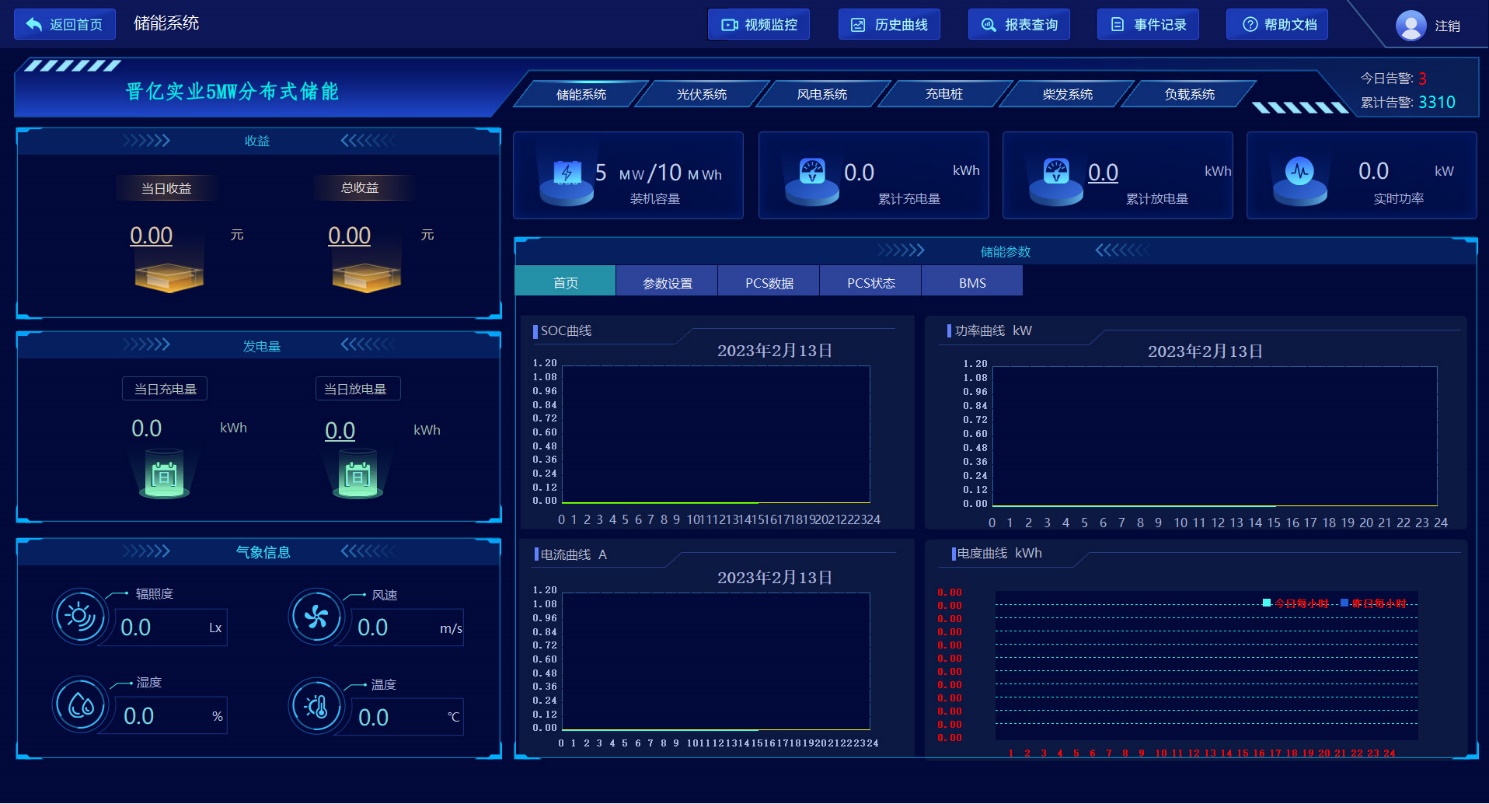 主要展示本系统的储能装机容量、储能当前充放电量、收益、SOC变化曲线以及电量变化曲线。