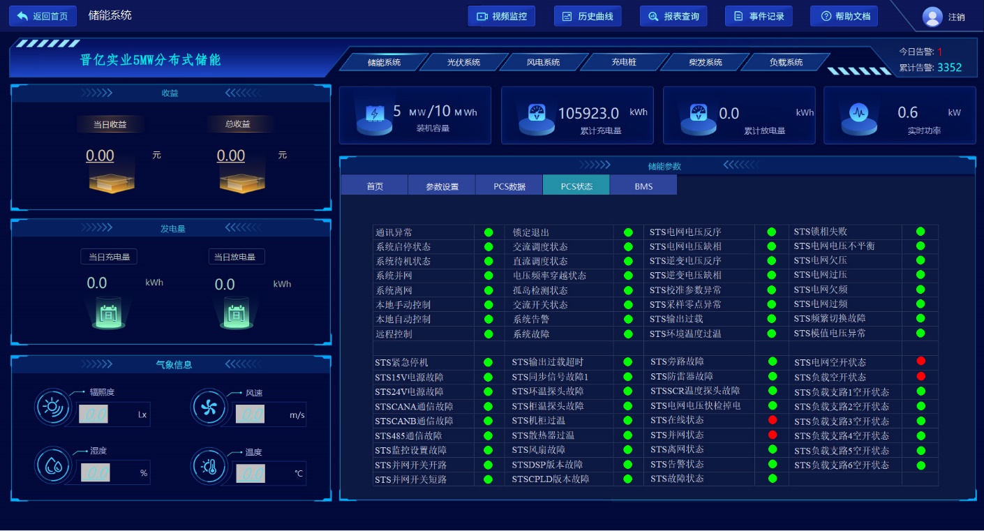 PCS作为储能系统与电网之间的桥梁,负责控制电池的充放电过程,将电池存储的直流电能转换为交流电能,或者将交流电能转换为直流电能以存储在电池中。系统监测显示PCS的运行状态、运行参数限值,交直流侧的运行状态、运行参数数据,系统对PCS的监控是确保储能系统高效、安全运行的关键。