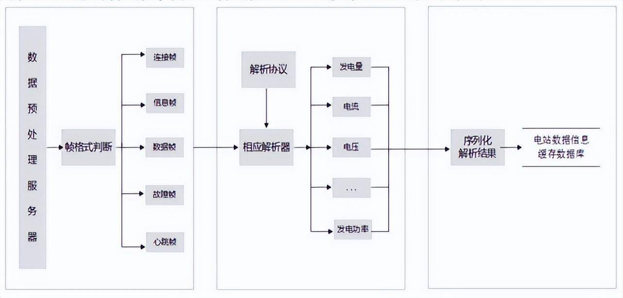 数据预处理模块功能实现:首先根据逆变器、电表、气象站等不同种数据帧格式协议,制定相应的多种解析器,获取帧中包含的电站数据信息;再获取传输到相应数据端口的帧,并将其放入正确的解析器中完成转义。数据预处理模块主要采用标志点匹配算法,对系统中使用到的各项帧格式进行分析,提取数据帧头,数据帧尾的数据格式与长度和整帧数据长度等,并将其作为标志点,然后对标志点进行自动识别与匹配,将原始帧区分后交由相应解析器实现解析。