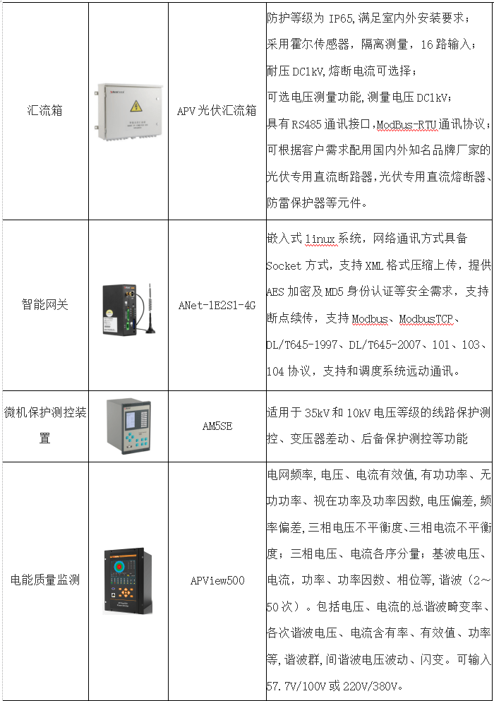 上图为一个1MW分布式光伏电站的示意图,光伏阵列接入光伏汇流箱,经过直流柜汇流后接入集中式逆变器(直流柜根据情况可不设置),最后经过升压变压器升压至10kV或35kV后并入中压电网。由于光伏电站装机容量比较大,涉及到的保护和测控设备比较多,主要如下表: