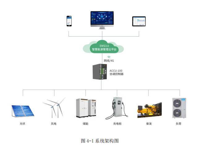 ACCU-100 协调控制器:控制储能设备、分布式能源、可调负荷设备的出力 与电力需求,并能根据经济效益模型在满足调度的前提下,进行光储置换,减少 弃光。并与云端平台进行交互,响应云端策略配置。 智慧能源管理云平台 EMS3.0:满足跨站点,跨区域海量数据的接入,通过 数据分析实现各站点资源类、电量类、损耗类、指标类、维护类、贡献类等指标 计算与管控,并通过多样化预测,分析发电与用电趋势,结合电价数据、生产计 划、负荷需求,提供最佳控制方案。同时提供远程监控与运维功能。