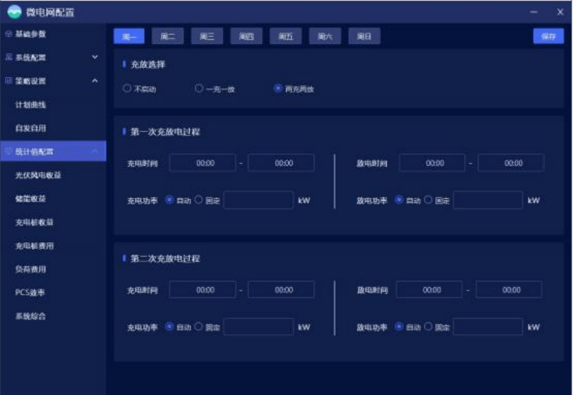 微电网配置主要对微电网系统组成、基础参数、运行策略及统计值进行设置。其中策略包含计划曲线、削峰填谷、需量控制、新能源消纳、逆功率控制等。