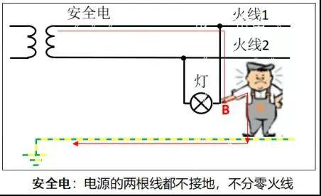 【电不伤人】人站在地上,人体碰到火线(图中B点),火线1的电流无法经人体、大地回到电源端火线2。构不成电流回路,不会有电流流经人体,人不会触电;