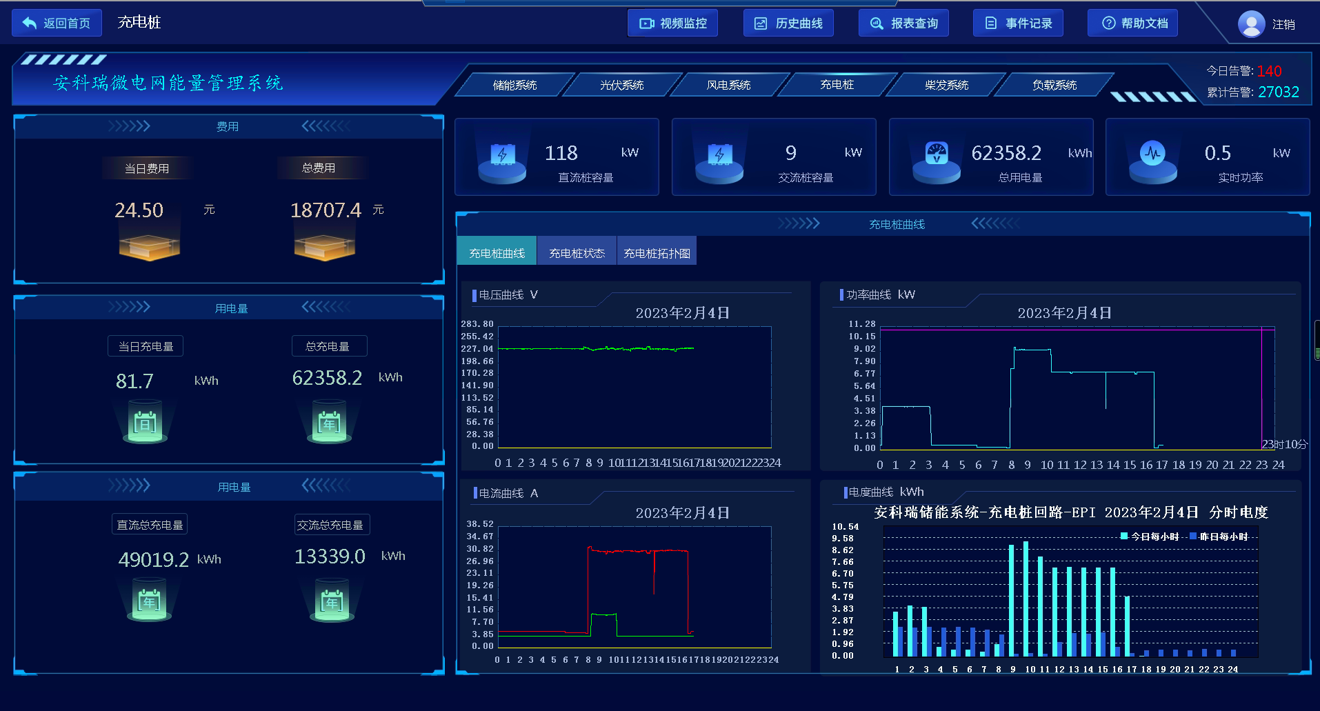 本界面用来展示对充电桩系统信息,主要包括充电桩用电总功率、交直流充电桩的功率、电量、电量费用,变化曲线、各个充电桩的运行数据等。