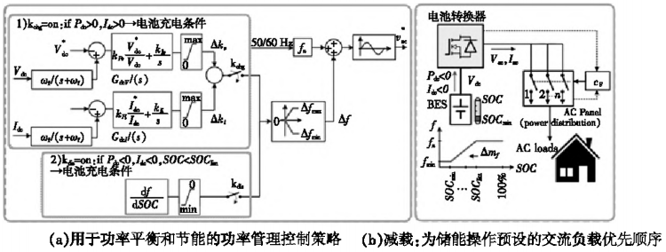 在低辐照度条件下,光伏能量不足以满足交流负载需求。交流负载减少操作如图3(c)所示,在较高的交流负载需求期间变为活动状态。电池SOC电量较低时,电池转换器降低线路频率(f),而频率变化会导致交流负载序列断开。电池的尺寸和帧是SOR的函数,并且取决于充电倣电速率、SOC范围、放电深度、循环次数和工作温度。系统转换效率的指标需要在系统选型时加以考虑,以确定从BES到交流端口的有效可用能量。