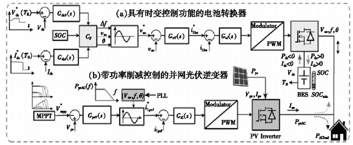 图2(a)为本文设计的一种通过控制光伏逆变器的功率来间接控制电池充电电压和电流的网格结构。用于线路频率控制的电池电压和电流控制器以比例积分(Proportional Integral,PI)补偿器的形式进行选择。图2(b)为在孤岛离网模式下运行的电池转换器,以及带有可控断路器的交流面板,用于分配交流负载。