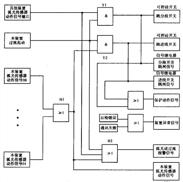 动作分析如下。本侧弧光信号动作,H1动作,同时本侧过流起动,Y2动作,通过快速接点(可控硅开关)跳进线开关。对侧弧光信号动作输入本装置,同时本侧过流起动,Y1动作,通过快速接点(可控硅开关)跳分段开关。本侧弧光信号动作、对侧弧光信号动作、本侧