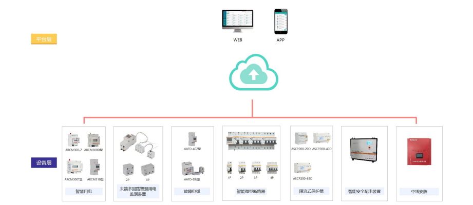 应用层:智慧安全用电管理系统web平台、手机app管理平台、短信报警系统等。