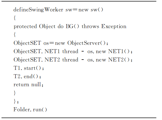 本文的研究采用Swing程序设计系统的信息传输功能。该程序作为一个线程,能够实现所有线程的特点,主要分为3个阶段,首行线程初始化,然后进行事件调度线程,若不影响程序运行,则进行事件调度工作。Swing程序主要进行任务线程调度和通信,可以较好的处理各个线程之间的通信关系,并且不影响相互协作,在处理管理系统中转节点通信方面具有非常高的效率。本文通过在SwingWorker中定义类对象的方式去实现多线程工作,具体实现代码如下。