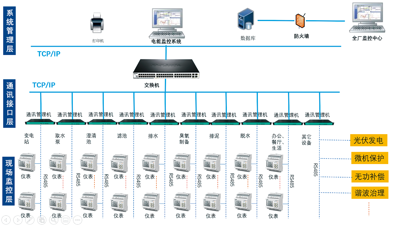 现场设备层:主要是连接于网络中用于水、电、气等参量采集测量的各类型的仪表等,也是构建该配电、耗水、耗气系统必要的基本组成元素。肩负着采集数据的重任,这些设备可为本公司各系列带通讯网络电力仪表、温湿度控制器、开关量监测模块以及合格供应商的水表、气表、冷热量表等。