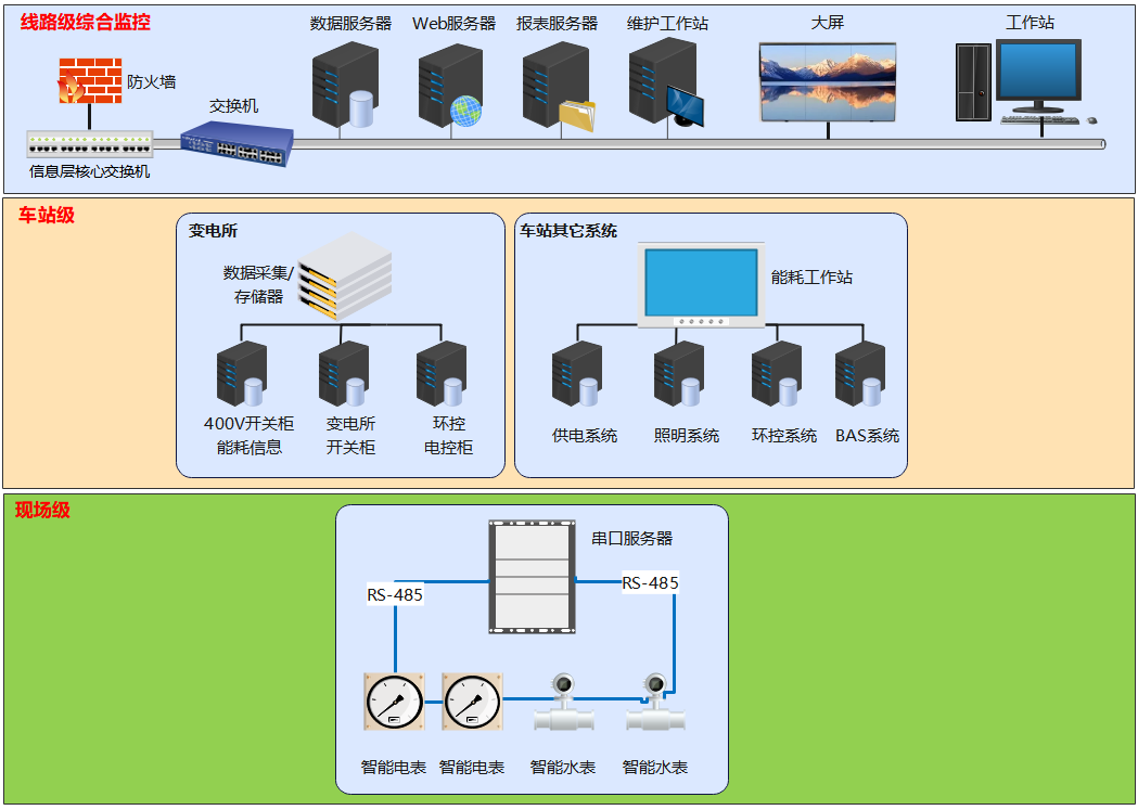 线路级系统设置于各线路的控制系统内,综合监控系统实现监控,是整个能耗管理平台进行数据交换的重要节点,能提供能耗管理系统实时运行界面和历史数据查询服务。主要硬件设备有服务器、工作站、存储设备以及通信网络设备等,用于现场能耗数据的处理、存储以及通信。