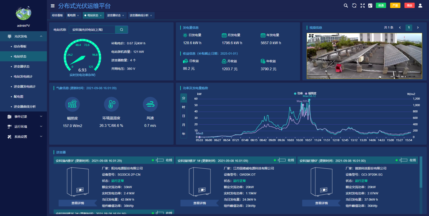 ●摄像头实时监测现场环境,并且接入辐照度、温湿度、风速等环境参数。