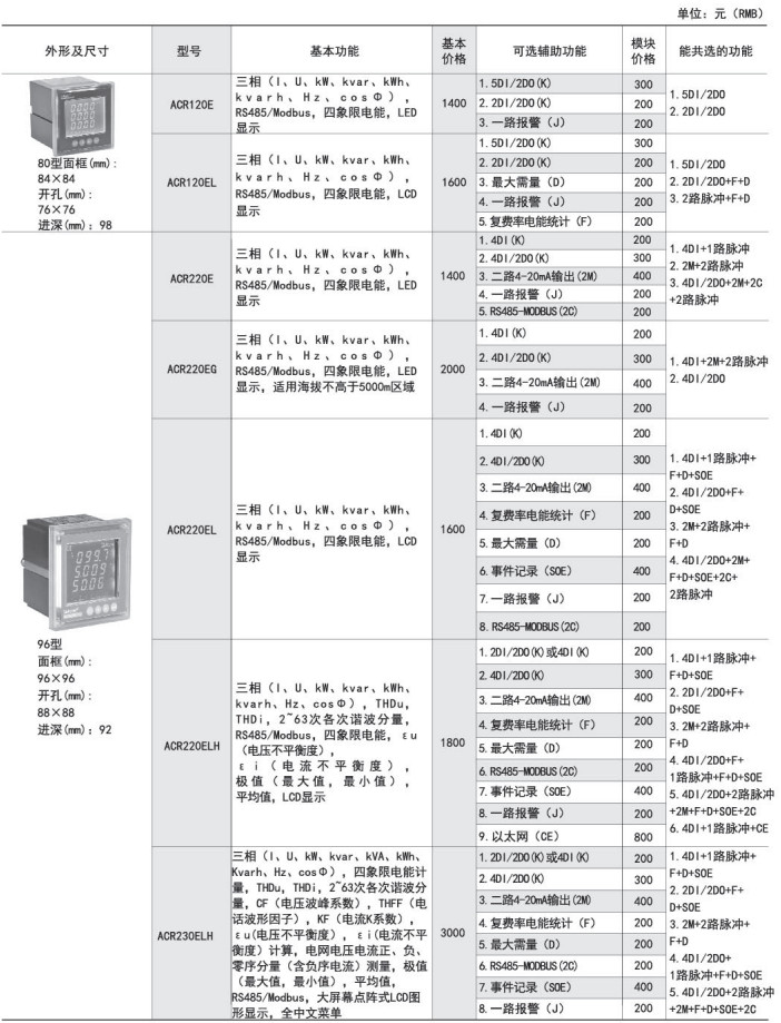 三相四线数显多功能网络仪表RS485通讯产品选型: