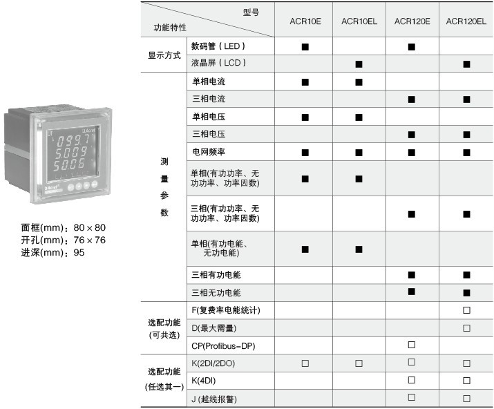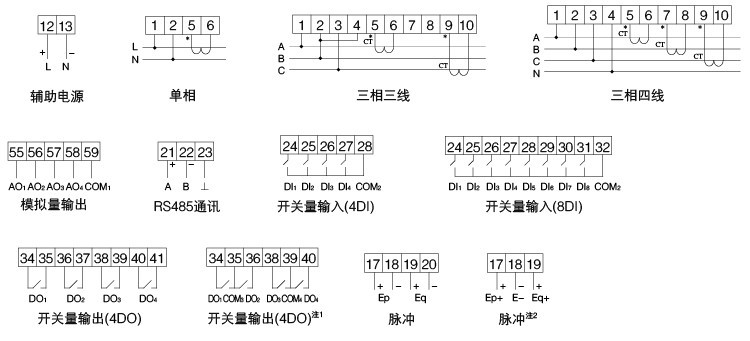 1.ACR320E(L)在选配K(4DI/4DO、8DI/4DO)功能时无脉冲信号输出端口;
