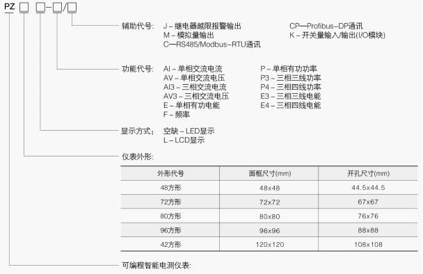 该系列仪表采用交流采样技术,能分别测量电网中的电流、电压、功率、功率因数和电能等参数,可通过面板薄膜开关设置倍率。带RS-485通讯接口,采用Modbus或Profibus协议;也可将电量信号转换成标准的直流模拟信号输出;或带开关量输入/输出,继电器报警输出等功能。-数显电流表PZ48-AI